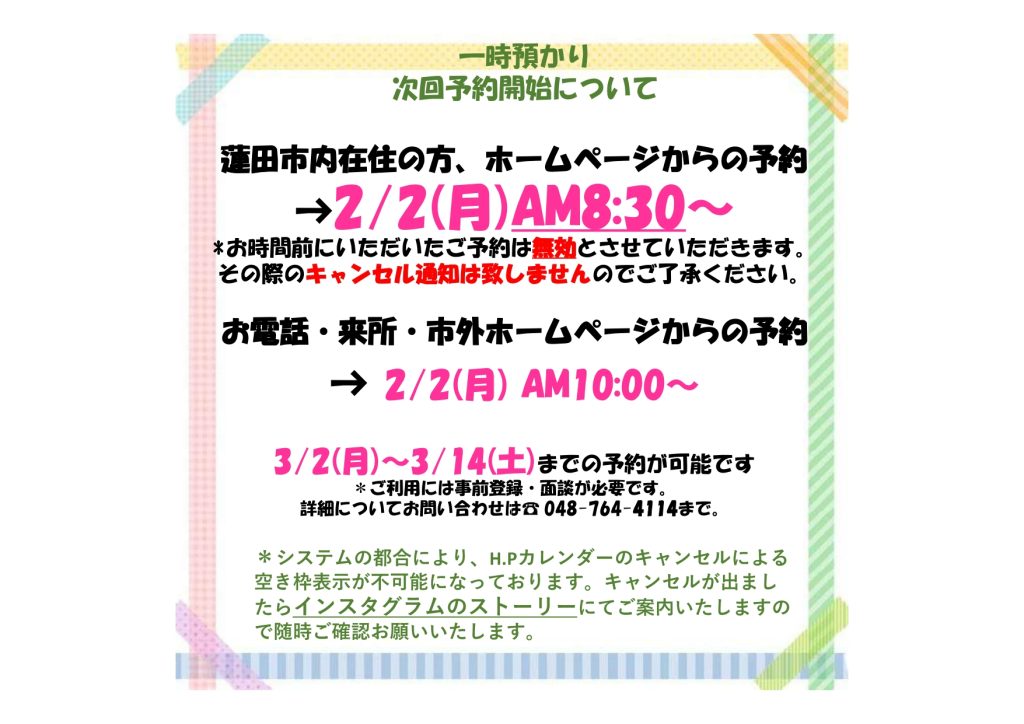 2026年3月2日~14日の一時預かり予約開始日のご案内です。