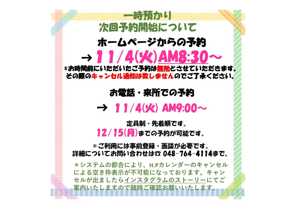 【11月4日から開始】12月1日~12月15日までの一時預かり予約